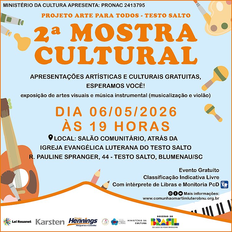 Estão abertas as inscrições (ano 2026) para o Projeto Arte para Todos - Testo Salto, venha participar das oficinas gratuitas para crianças e jovens de 6 a 16 anos! Oficinas a partir do dia 2 de fevereiro de 2026. LOCAL: ASSOCIAÇÃO KARSTEN - R. Heinz Scheidemantel, 268, Testo Salto, Blumenau/SC. ...