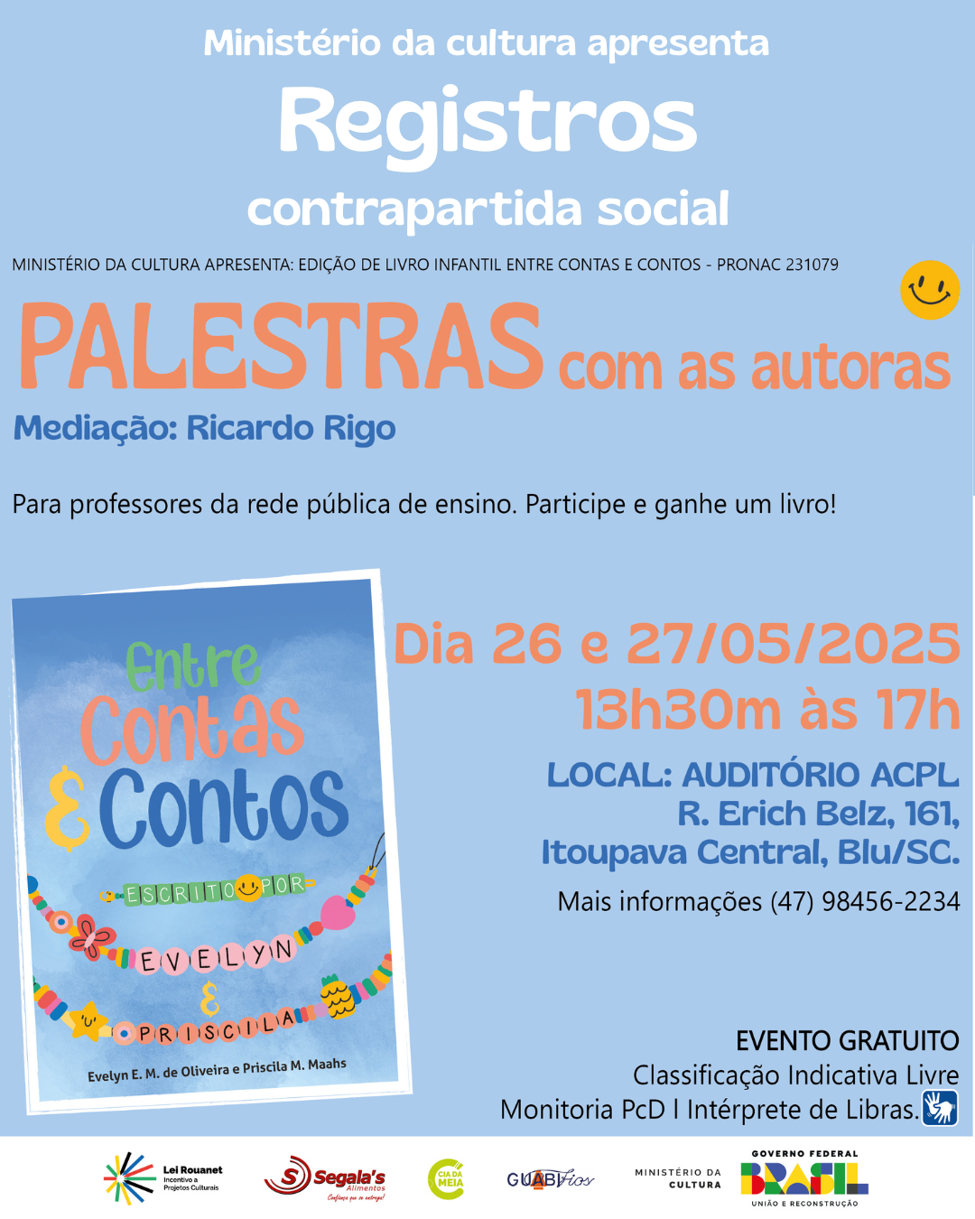 2025 60 visualizações Divulgação Palestras com as autoras Evelyn E. M. de Oliveira e Priscila M. Maahs, na ACPL! Projeto Edição de Livro Infantil entre Contas e Contos - Pronac: 231079. . Galeria de fotos Postado por Comunhão Martim Lutero Postado há 9 meses Tags: divulgação, Projeto Edição de Livro Infantil entre Contas e Contos