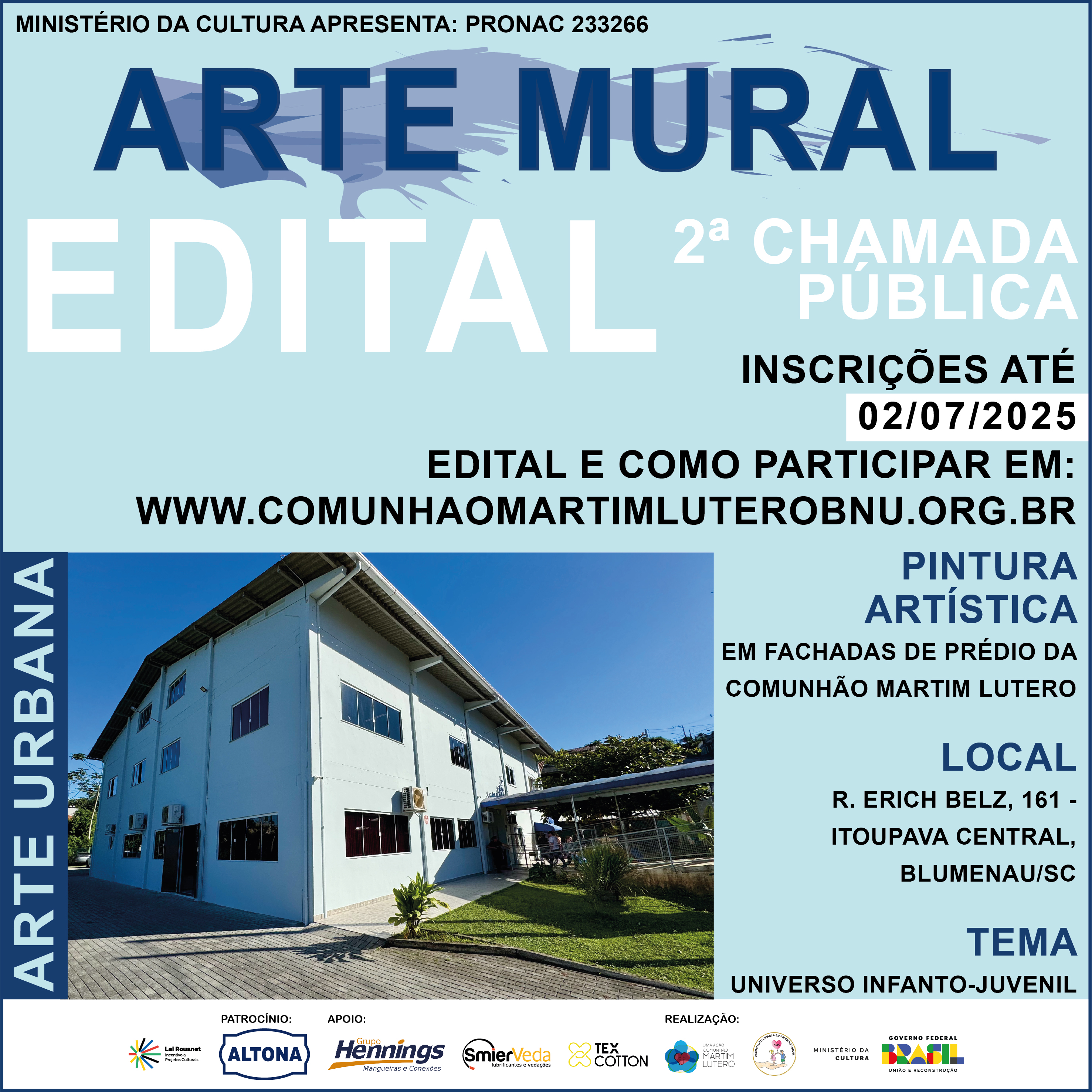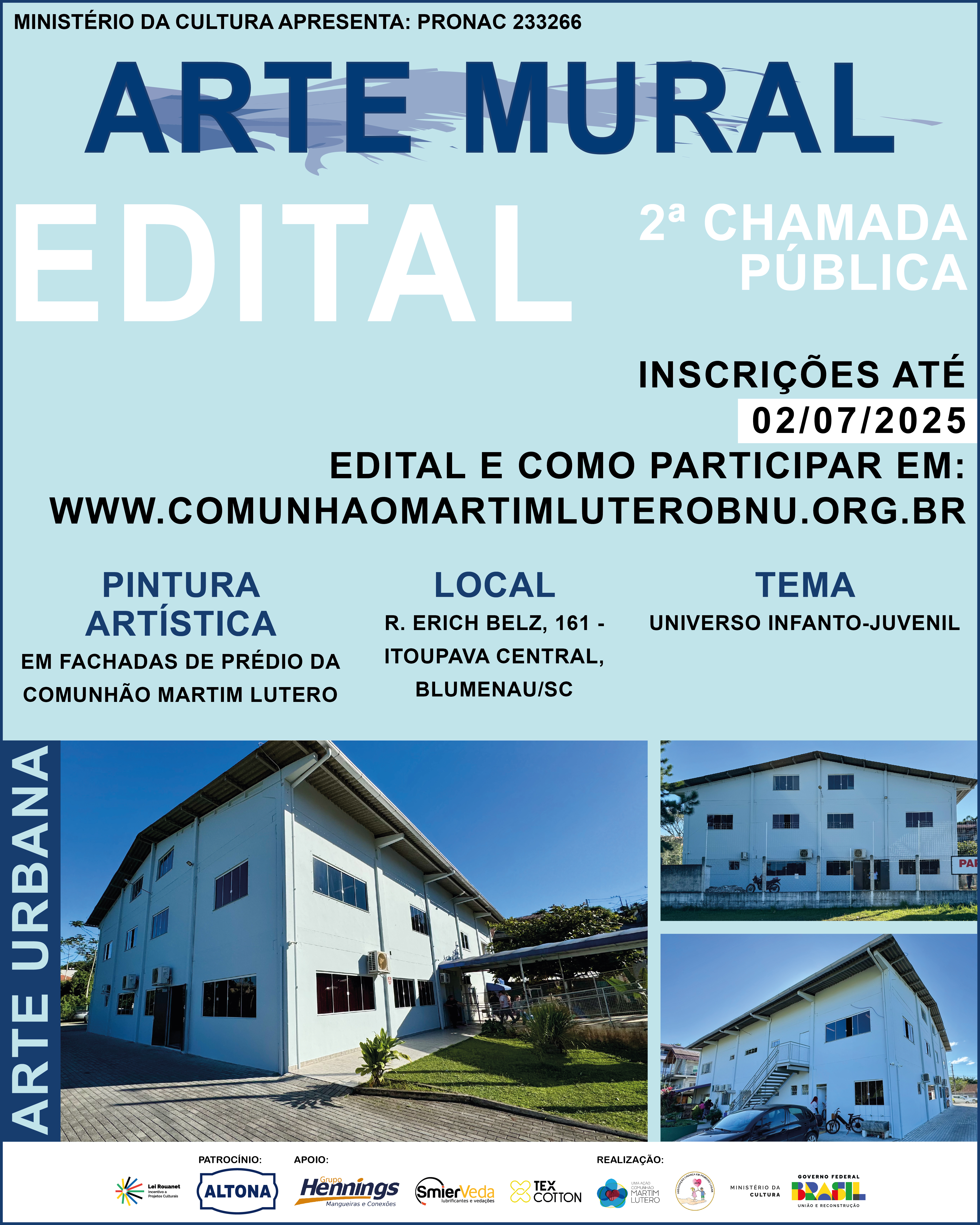 A comunhão Martim Lutero vem, através deste, comunicar a abertura de 2ª CHAMADA PÚBLICA para EXECUÇÃO DE PINTURA ARTÍSTICA EM FACHADA DE PRÉDIO.