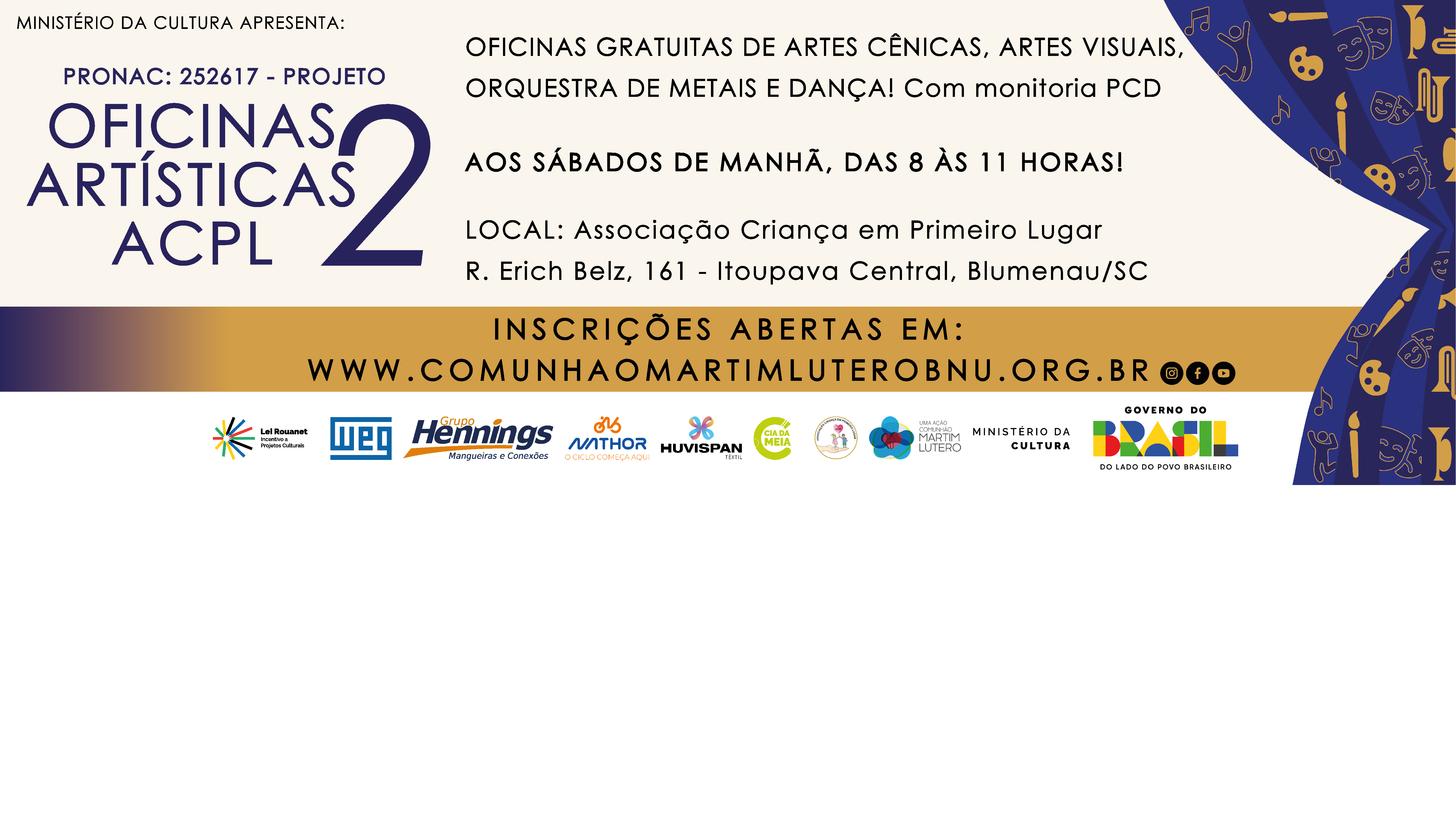 O projeto prevê gratuitamente a oferta de oficinas artísticas (aos sábados de manhã) de artes cênicas, artes visuais, orquestra de metais e dança, para jovens e crianças, durante o ano de 2026, na Associação Criança em Primeiro Lugar - ACPL, localizada na R. Erich Belz, 161, Itoupava Central, na cidade de Blumenau/SC.